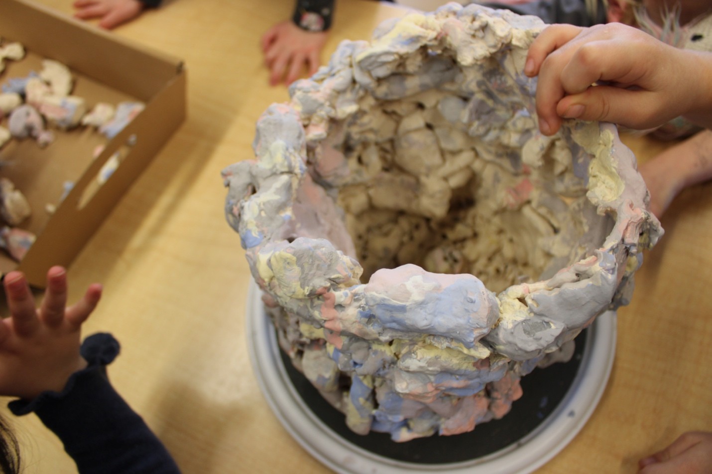 A small coil bowl was created and added to the city. Some children asked how to make one too. I wondered out loud: “Could we make a bowl together?” We talked about what a bowl needs—how it holds, how it grows, what the clay might ask of us. Over many weeks, something vessel-like took shape. We said it belonged to everyone. We agreed to add only little bits at a time, pressing gently into what already existed. After each encounter we carefully put our growing vessel into a humidor or wet-box—a five-gallon pail with a layer of plaster in the bottom that maintained the clay vessel in a pliable state until the next time we wanted to work on the bowl. Then, one day, we opened the pail where the bowl rested. It had collapsed into a pile of pieces. No one said anything right away.