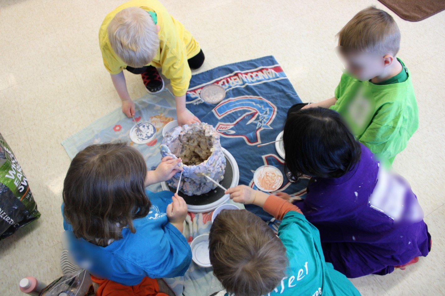 This painting moment did not aim to finish the vessel or decorate it in a specific way. Instead, it became part of the longer process of being with clay, another way the children gathered, contributed, and stayed present with something shared.