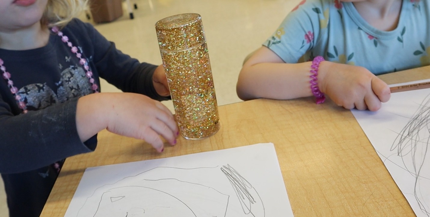 Thea holds up a sensory tube while pointing to her drawing. “Put it on this so it stays up. These are all the instructions.”