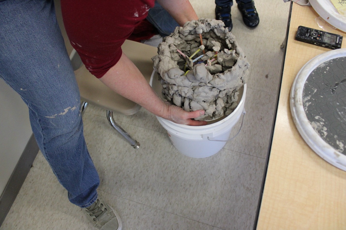 Our work with clay began more than a year and a half ago and has slowly unfolded across many moments, encounters, and returns. In those early gatherings, large blocks of clay joined the group at the table. Hands squeezed and twisted. Earthy smells infused the room. Slowly we became aware of clay’s movements and sounds. We learned what clay needed from us at the end of our weekly encounters so that we could meet again. Clay was collected in a bag and snuggled safely in a container. Tables and hands we washed with basins of water, the clay slurry poured onto the grass outside so it would not get trapped in the plumbing.