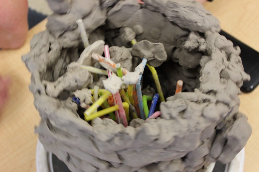 We return to the children’s drawings—sketches full of ideas for how to keep the bowl from falling—and begin again with the base from the first vessel. Small bits of clay are added around the perimeter, slowly, carefully. We offer the materials from their drawings: sensory tubes, paper rolls, and plastic straws. The straws, thin and upright, draw the children in. They name them necessary. The straws hold—for a while. But as more are added, they begin to lean outward, pulling against each other. The bowl’s centre grows crowded. We wonder: How many can it hold? The straws slump. They ask for something, too. Attention shifts—back to the clay, back to the walls. The materials are not passive here. They press back.[3]
