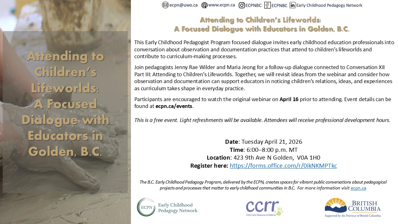 This Early Childhood Pedagogist Program focused dialogue invites early childhood education professionals into conversation about observation and documentation practices that attend to children’s lifeworlds and contribute to curriculum-making processes. Join…