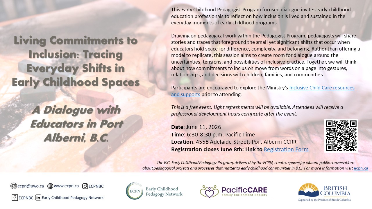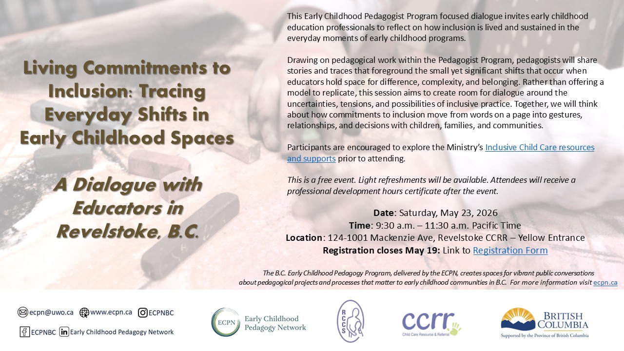 Join this Early Childhood Pedagogist Program event to hear pedagogists Heather Van Harten and Karen Rodden in conversation with educators about how they work with pedagogical commitments in their practice.…