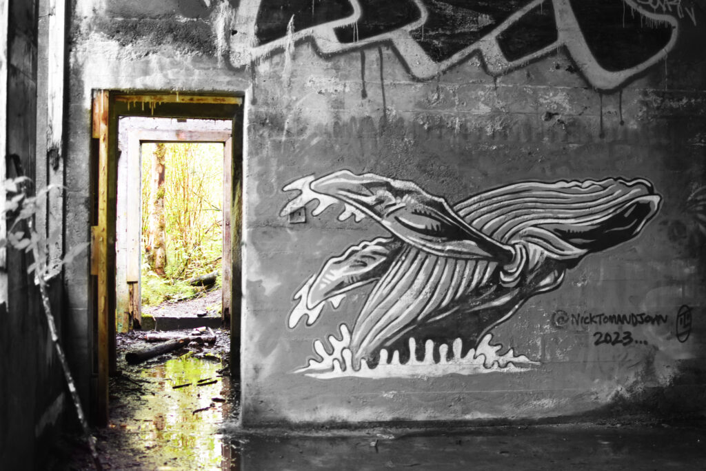 Miller Bay is an abandoned site just outside of Prince Rupert, British Columbia. To reach it, we had to abruptly exit the desolate highway onto a small gravel pullout just after a dangerous curve. From the vehicle, we walk in to the site through dense underbrush. The trail to the hospital grounds splits into two, and we choose the wrong path at first. Our ankles slosh in rivulets of rushing water as we head further and further into tangled brush. Scrambling to turn around and reorient ourselves, we struggle to keep our bearings. Once we relocate the lower path, the forest is so dense we don’t see the site until we are upon it. After plodding through the soggy, stream-filled brush, side-stepping slugs and mossy, slime-covered rocks, we step into the ruins. The smokestack of a brick incinerator towers above the dense trees.