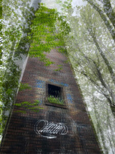 Before leaving, I stand for a few moments next to the towering brick smokestack, placing my hand against it. The solidity of the rough brick is sobering. There is a door in the base of the stack where coal, wood and other materials must have been placed to be incinerated. My body shivers as I take in the presence of a giant cedar tree whose roots now encompass the base of the chimney. A hole gapes between two of the tentacling roots, inky dark. I wonder what this tree has seen in its lifetime. I wonder what histories of this place it holds, and what it knows about the smokestack it now cradles. What encounters has it had with other beings and forces, including viruses and bacteria? A sudden urge of tears overwhelms my body as I offer a prayer of remembrance for the souls who lived and died in this place. As Kirsten and I walk back to the road, I recognize that this place has offered me a reminder that the land is a survivor of generations of extraction and colonization. It bears witness and is affected by human choices. It holds memories within place, and not all memories are idyllic. Even as the landscape reclaims human structures, traces remain.