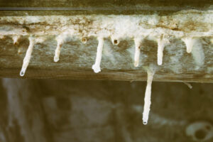 Water drips from the broken roof, the cascade creating calcified bumps on the concrete that look like stalactites and stalagmites in a cave. Everything is wet. The damp air makes movement difficult as our bodies push against a current with each step.