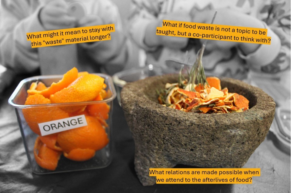 In everyday educational contexts, orange peels are typically swept into the compost bin, or perhaps folded into lessons on environmental responsibility. Here too, knowledge is often positioned as the child’s ability to demonstrate the “correct” steps of composting or to sort waste into the “right” bin. This moment instead calls us to linger, to resist efficiency and certainty, and to dwell with something slow, situated, and uncertain.