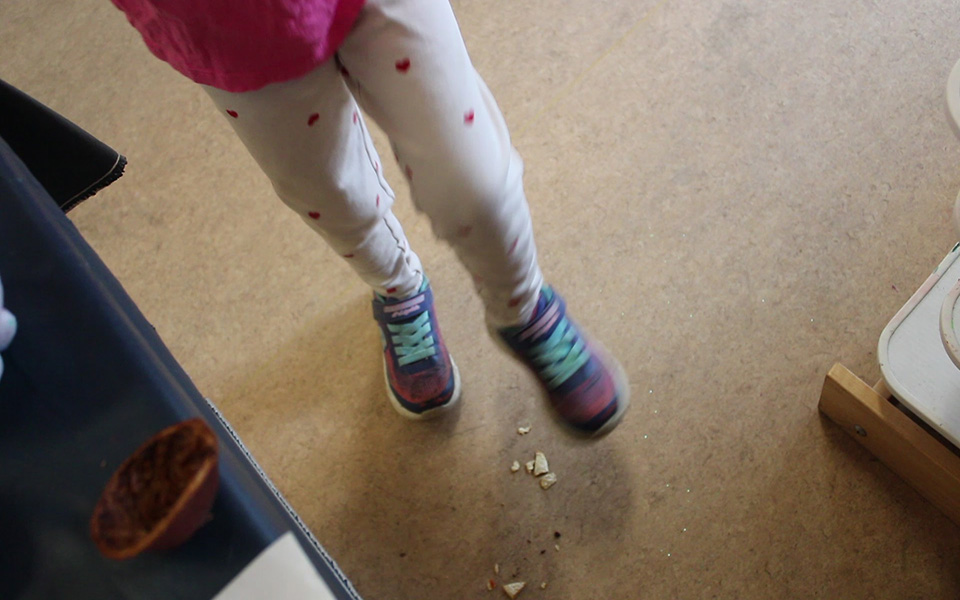 As children-educators-pedagogist stay with the orange peels over time and attend to their slow transformations, we notice that the peels’ once-bright skin slowly fades to muted tones of amber and brown. The juicy and pulpy skin stiffens and curls at the edges. A few dried peels roll from the table onto the floor. Nearby, Lennon shifts her body as she stays at the orange peel table. A sudden crack interrupts and catches her attention. She looks down to see that she has stepped on a peel, now splintered into tiny pieces beneath her shoe.
