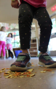 From this accidental encounter, a new invitation emerges. Other children drop dried orange peels onto the floor, this time with intention. Soon the room fills with crisp snaps as children stomp, jump, skip, slide, spin, and fall on the peels. In this moment, the dried peels invite bodily movements that extend onto the floor.