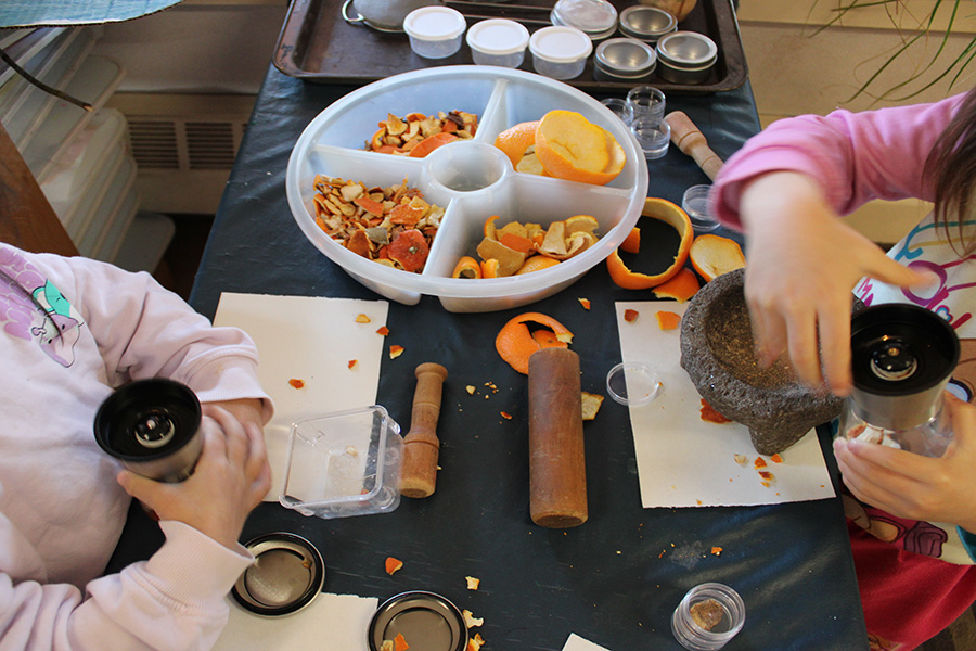 Alex and Holly cut and grind the orange peels into small pieces. When a piece refuses to break down, Alex grunts with effort.
