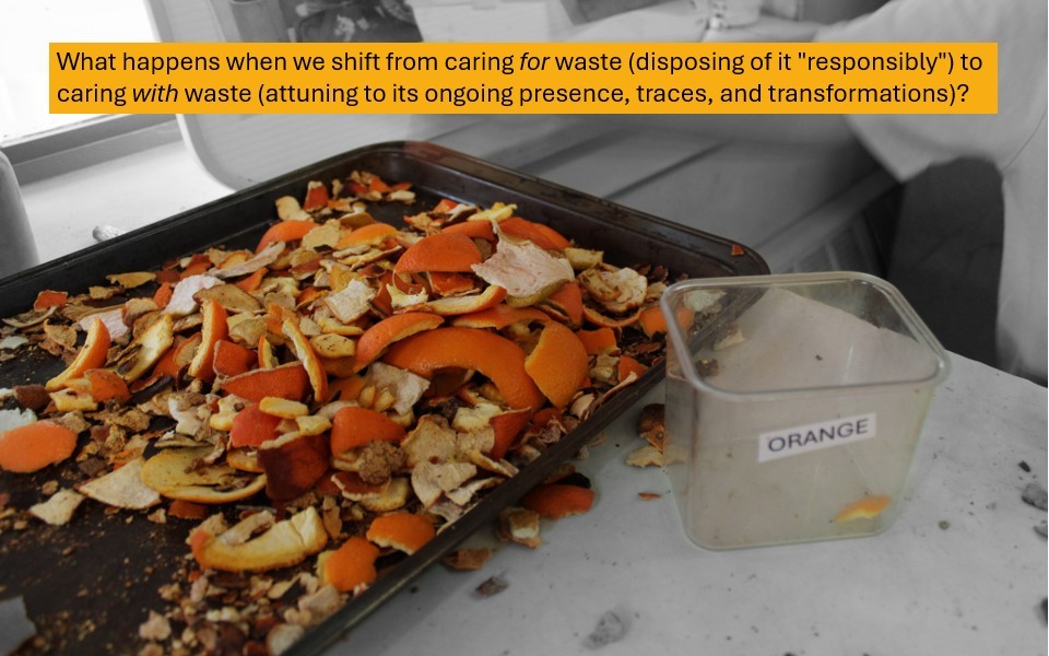 In this field note, these commitments come alive with encounters with orange peels, remnants of everyday life that are typically dismissed. The orange peels’ stickiness, scent, and slow decomposition invited us to stay with the overlooked, to think with waste as something alive, and to consider how relations might form around what is usually cast aside.
