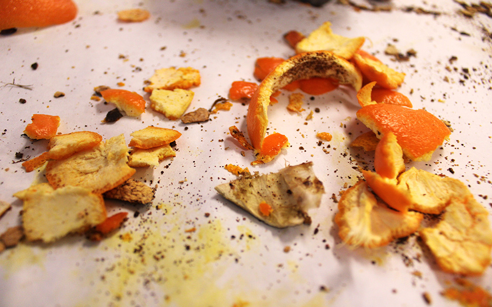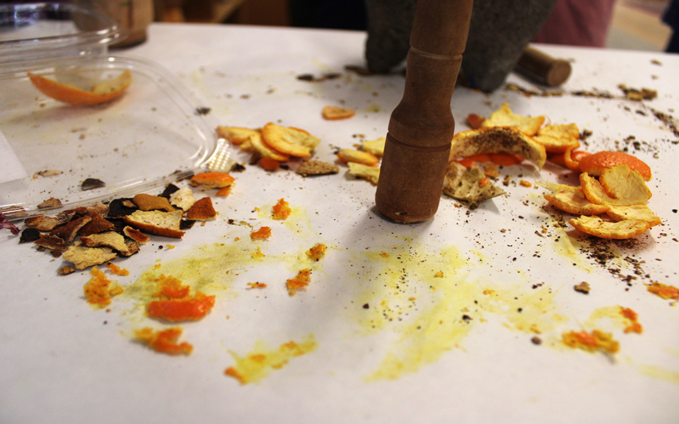 Orange peels scatter and spread across the table in various states of transformation, some freshly torn and soft to the touch, others browned and curled, a few still charred. Fingers, hands, and wooden sticks meet the peels, pressing, tearing, and mashing. In the midst of this encounter, Holly pauses, holding up her hand for everyone to see.