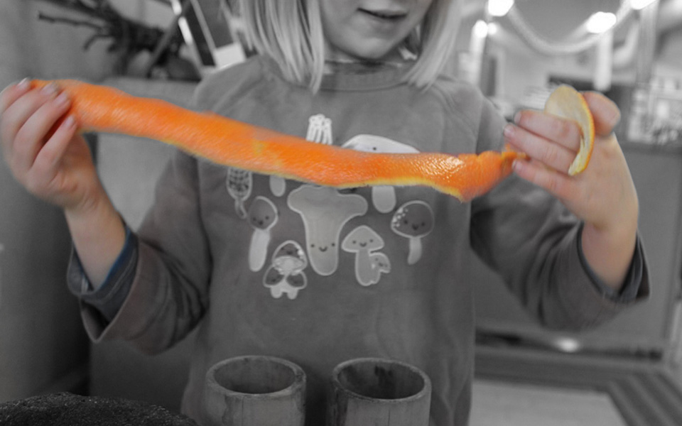 Each day, the peels draw us into new encounters. The children, educators and I pay attention to: What conversations are orange peels inviting/resisting us to be in? What ways of knowing are being opened when we stay with orange peels rather than discard them?